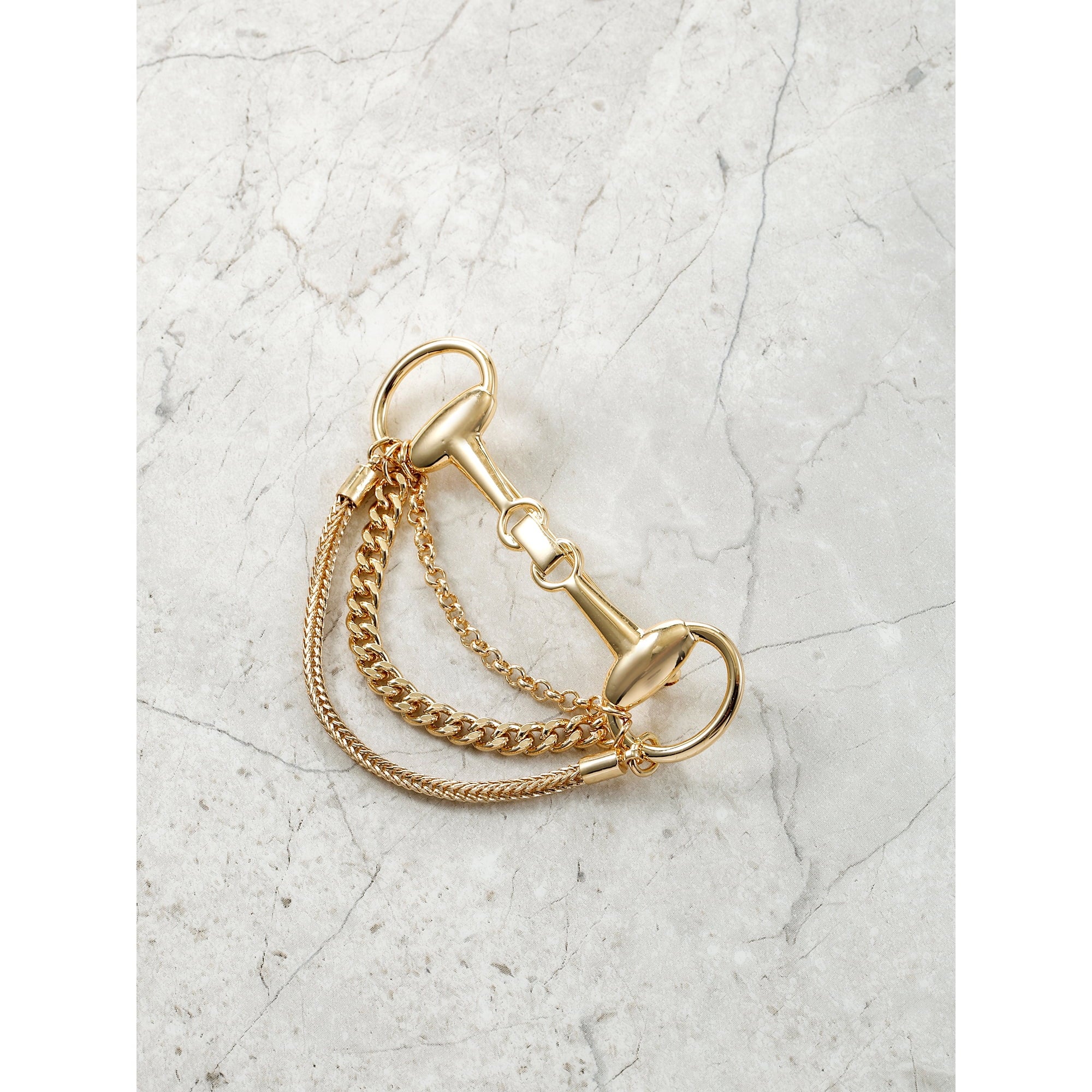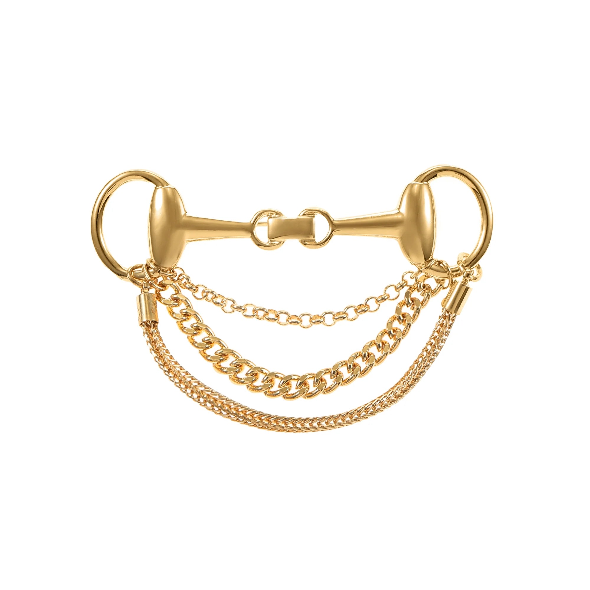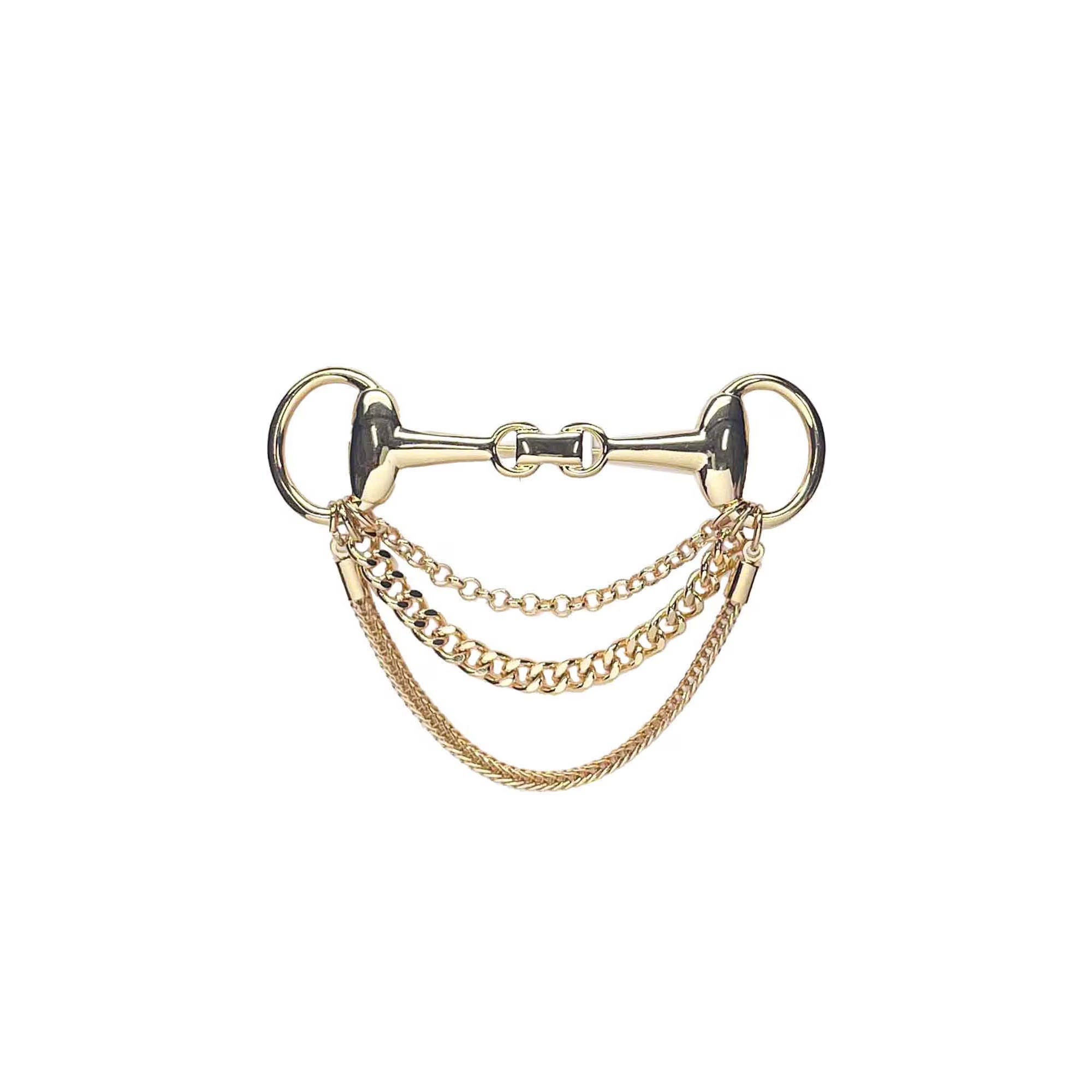 Product details This equestrian inspired statement brooch from Time and Tru features a classic, goldtone horse bit shape with draped chain accents. The versatile styling makes this brooch the perfect choice for adding a contemporary and elegant touch to any...