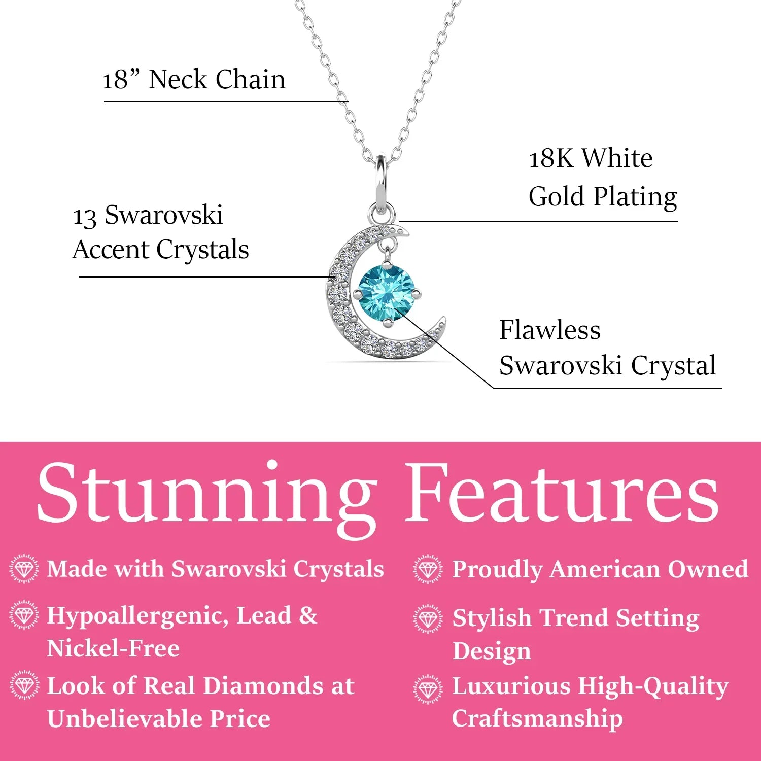 • NECKLACE FEATURES – Expertly crafted for women who appreciate meaningful elegance, the Luna Birthstone Necklace is made from 18k white gold-plated brass and features a beautifully sculpted crescent pendant. It is adorned with 1 stunning 5.2mm round-cut Swarovski® feature stone and 13 glimmering accent stones (1.5mm and 1mm sizes). The pendant measures 10.8mm wide x 16.4mm high x 4.6mm long, and the necklace includes an 18-inch chain secured with a durable lobster clasp for lasting comfort and ease of wear.