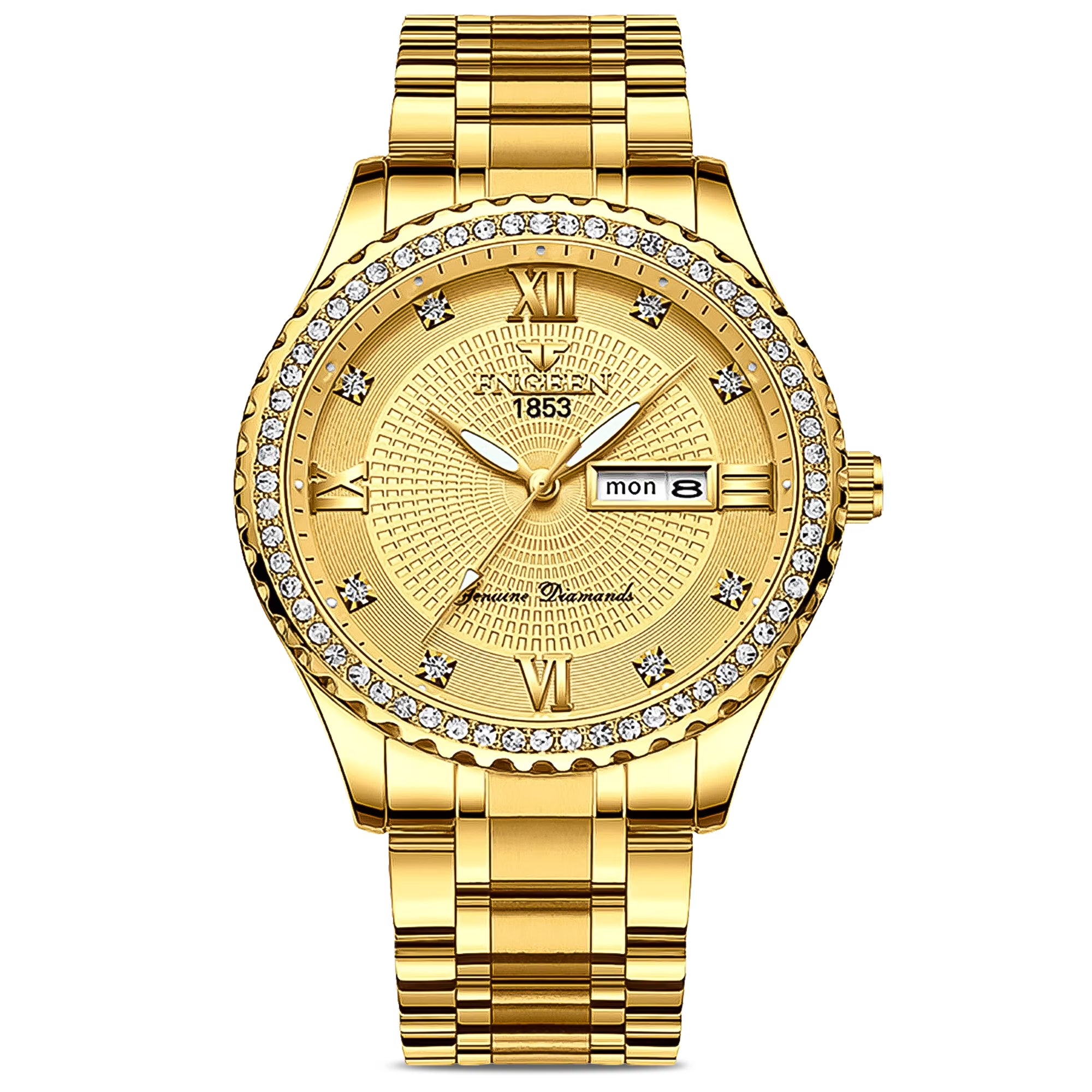 EEEkit this classic diamond gold watch, which shows the luxurious atmosphere and demonstrates your noble status. You are the most dazzling one in the crowd with it. Our EEEkit men's quartz analog watch adopts Japanese original quartz movement and precision quartz movement and features a date display, to provide you with accurate timekeeping and convenience for you to check the date. With its high-quality materials and attention to detail, it is designed to make you feel confident and stylish wherever you go More importantly, this stainless steel waterproof watch can be matched with all kinds of clothes and is suitable for all kinds of places. And also it is a perfect gift for the boyfriend/husband