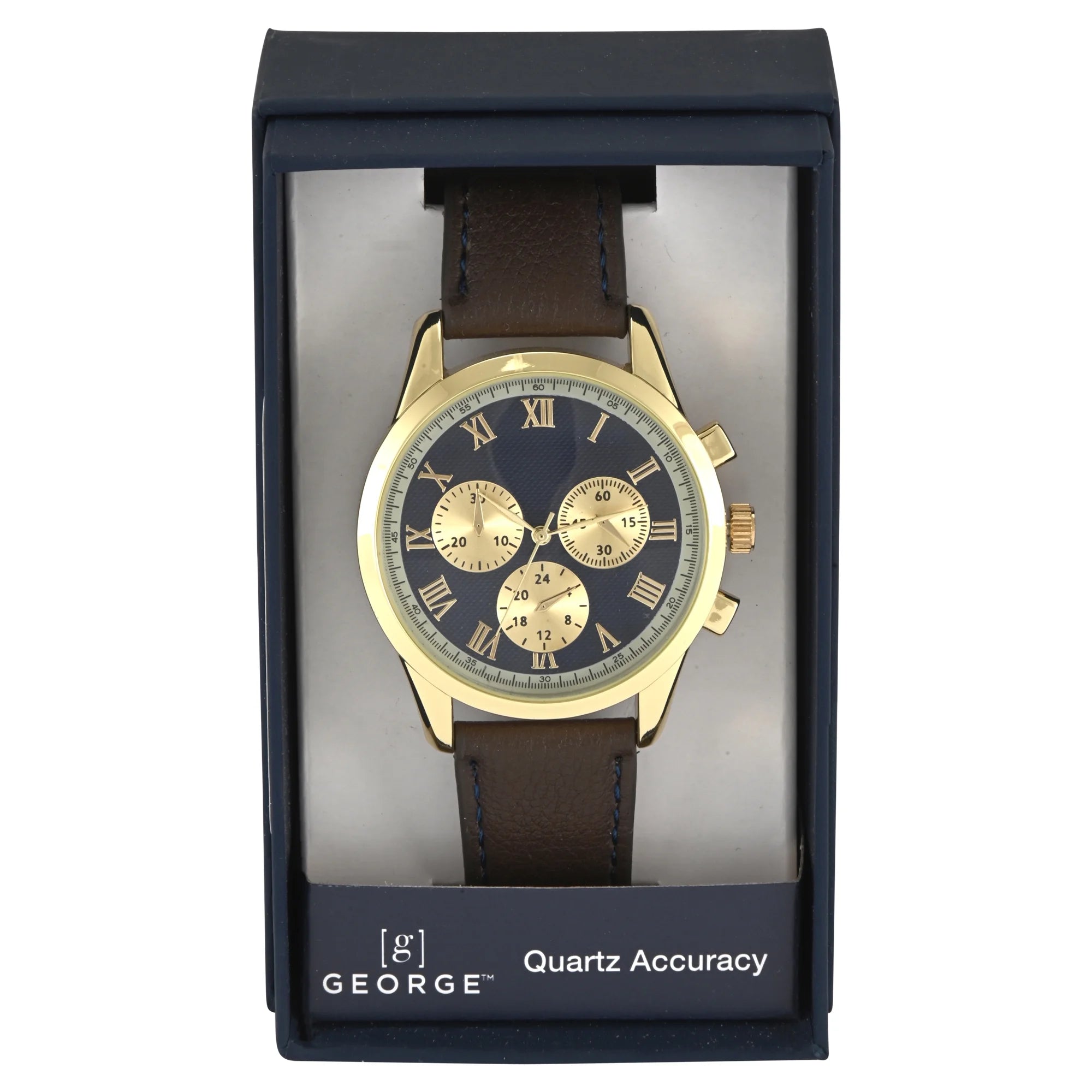 George Men's Gold Round Case with Navy 3 Faux Eye Dial and Smooth Comfortable Brown PU Strap Watch