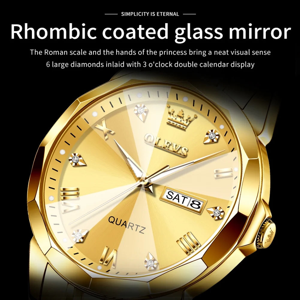 OLEVS Watch for Men Diamond Business Dress Analog Quartz Stainless Steel Waterproof Luminous Date Luxury Casual Wrist Watch Gold Dial